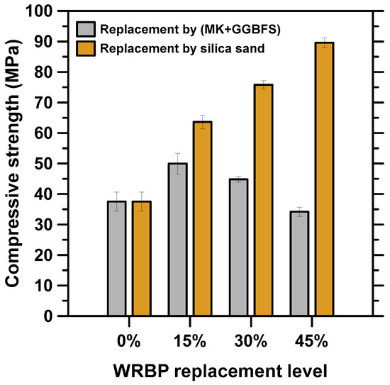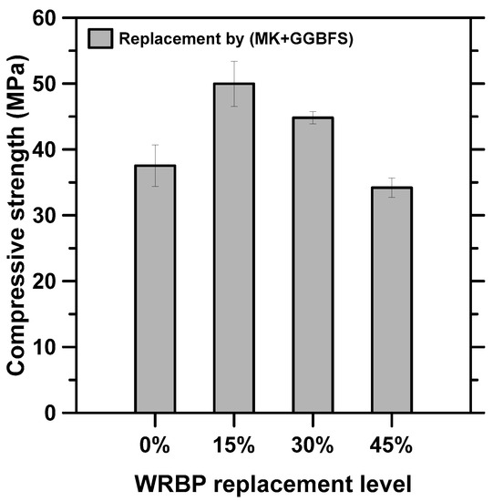 Figure 4 illustrates the compressive strength of the AAMs prepared using WRBP as GGBFS and MK replacement at 28 days of curing age. The inclusion of WRBP as ternary binder replacement was shown to significantly improve the compressive strength. The replacement of MK and GGBFS by 15% of WRBP led to a remarkable improvement in the geopolymerization process, increasing the compressive strength from 37.54–49.98 MPa. On the other hand, the increasing replacement level of MK and GGBFS by WRBP from 15 to 45% led to a drop in the compressive strength from 49.98 to 34.20 MPa, respectively. It is well known that the calcium and aluminium oxides significantly affect the alkali-activated materials’ strength development [40]. With dropping levels of MK and GGBFS from a 100% based binder to 70% and 55%, the content of both oxides significantly decreased and affected the dense gels formulation; this reduction in gel formulation eventually led to an increase in the pores, thereby causing lower strength. Additionally, since silicon oxide cannot exist in its free form at the temperatures required to produce red bricks, and since the WRBP lacks free significant amorphous content (Figure 2), this decrease in compressive strength can be attributed to the effect of higher WRBP content in the mixtures proportioned using 30% and 45% WRBP and the alkalinity of the activator might not be high enough to enable the formation of a sufficient amount of reaction products by breaking down the Si–O–Si and Al–O–Al bonds. In addition to this, the compressive strength of the suggested AAMs was affected by the large particle sizes of the WRBP in comparison to those of the MK and GGBFS, which led to a lower strength in comparison to the control specimen.
