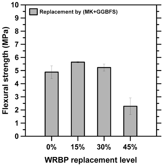 Figure 5 displays the variation of flexural strength of the designed AAMs as a function of WRBP contents as MK+GGBFS replacement at 28 days of curing age. The replacement of the ternary binder by 15% of WRBP led to an improvement in the flexural strength from 4.88 to 5.64 MPa. However, the increasing content of WRBP to 30 and 45% caused a drop in flexural strength values to 5.23 and 2.29 MPa, respectively. The high content of WRBP (30 and 45%) in AAMs caused a drop in the content of CaO and Al2O3 and reduced the total dense gels formulation.