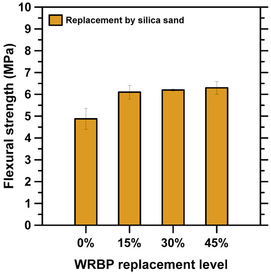 Figure 6 illustrates the effect of WRBP as silica sand replacement on strength development of the prepared mortars at 28 days of curing age. The results indicated that the increasing level of replacement of WRBP from 0 to 45% significantly enhance the gained compressive strength. The compressive strength was increased from 37.54 to 89.62 MPa with a raising level of WRBP from 0 to 45%, respectively. Likewise, the inclusion of WRBP in the mortars matrix as silica sand replacement was found to improve the flexural strength values (Figure 7). Compared to the control sample, all the specimens containing various levels of WRBP achieved higher flexural strength values. Specimens prepared with 15% of WRBP displayed flexural strength 6.10 MPa compared to the control sample (4.88 MPa). The specimens prepared with 30 and 45% achieved almost similar flexural strength of 6.20 and 6.30 MPa, respectively.