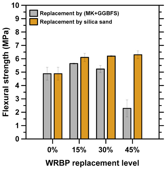 Effect of WRBP replacement (%) for MK+GGBFS on the flexural strength of AAMs.