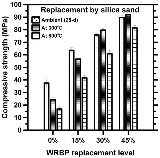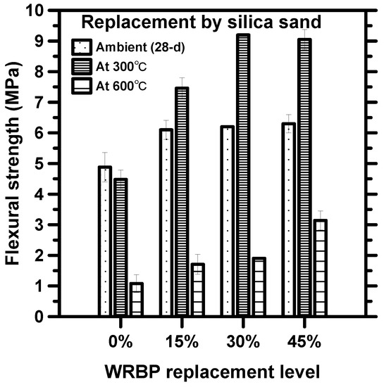 Figure 12 and Figure 13 show the influence on the compressive strength and flexural strength of the prepared AAMs due to the inclusion of WRBP as silica sand replacement, respectively. It was found that the AAMs containing 0 and 15% of WRBP were significantly influenced by the curing temperatures and the values decreased with the increase in curing temperatures from ambient temperature to 300 and 600 °C. However, the specimens of prepared AAMs containing 30 and 45% of WRBP and cured at 300 °C displayed an enhancement in compressive strength compared to the control sample. Contrarily, the increasing curing temperature to 600 °C led to a drop in compressive strength, being lower than the control sample. Similar results were observed (Figure 13) for the flexural strength; the specimens containing a high amount of WRBP (30 and 45%) that were cured at 300 °C achieved an increment in flexural strength values compared to the control sample. However, all the mortars containing various levels of WRBP (0, 15, 30, and 45%) were influenced by increasing the curing temperature to 600 °C and displayed lower strength compared to the control sample.