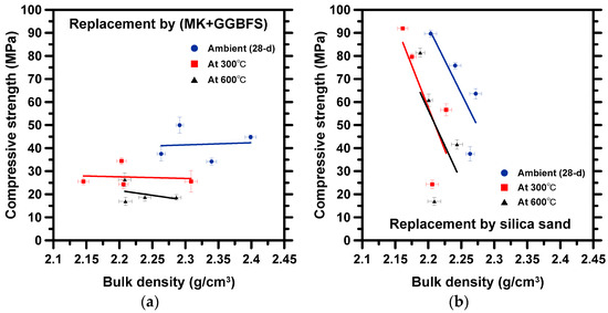 Figure 14 displays the relationship between bulk density and compressive strength of prepared mortars with WRBP as binder or fine aggregate replacement that were obtained under different curing temperatures. The specimens containing WRBP as GGBFS and MK replacement and cured at ambient temperature displayed direct relationship between the compressive strength and bulk density. The compressive strength tended to increase with increasing bulk density of prepared specimens. Contrarily, for the specimens cured at 300 and 600 °C, it was found that the compressive strength tended to decrease with increasing bulk density. However, for the specimens containing WRBP as silica sand replacement, the inverse relationship between compressive strength and bulk density was observed, for all different curing regimes (ambient, 300, and 600 °C). It was found that with an increase in bulk density, the compressive strength tended to decrease and displayed lower values.