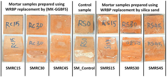 Figure 15 displays the effect of WRBP as binder or fine aggregates replacement on the efflorescence and visual appearance of alkali-activated mortar specimens. The addition of WRBP in the AAMs could significantly reduce the efflorescence and improve the mortars’ durability. The mortar containing 45% of WRBP displayed the optimum performance compared to other specimens. However, the specimen containing 45% of WRBP as GGBFS and MK showed more pores in the surface morphology compared to the control sample.