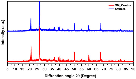 Figure 16 illustrates the XRD pattern of the AAMs containing 0 and 45% of WRBP as silica sand replacement at 28 days of curing age. The intensities of quartz peaks at degree of 21, 28.1, 42.5, 55, 60, and 75 were found to decrease with the increasing content of WRBP from 0 to 45% as silica sand replacement. The reduction in the intensity of quartz peaks with the inclusion of 45% of WRBP can be attributed to the participation of more SiO2 in the geopolymerization process, formulating more dense gels that contributed to the improvement in CS of the AAMs compared to the control sample. In addition, the XRD pattern of the specimen containing 45% of WRBP showed more amorphous phase compared to the specimen prepared with 0% of WRBP. The lower crystallinity in the AAMs containing 45% of WRBP was responsible for the lower amount of non-reacted particles and significant increment in the N, C-(A)-S-H gels formation.
