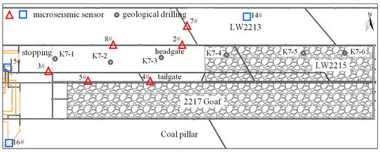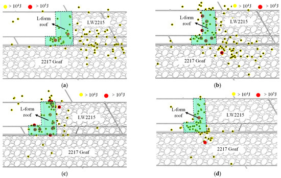 - Through the analysis of the multi-layer thick and hard roof structure, surface subsidence and mining speed, it is concluded that the main reasons for the frequent large-energy EWI mine seismic events in LW2215 with most events located in the advanced section of the working face are induction of an “advanced and lateral” L-form roof, gradually breaking of the multi-layer thick hard roof, the thick hard roof group bending and prying effect, and excessively fast or uneven mining speed.