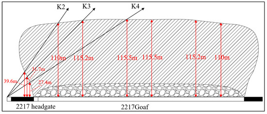 - The composition of the strata above the working face is special, comprising multi-layer thick and hard roofs, and the structure of the thick and hard roof group changes after mining. Different roof group structures have different loading mechanisms on the roadway surrounding rock, and the influence areas of the instability dynamic load also differ. When the goaf working face is mined, an “advanced and lateral” L-form roof will form under the coupled influence of the lateral suspension plate formed above the upper working face and the roof of the working face.