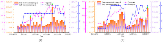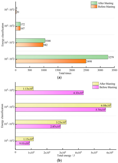 | Energy Classification | Changes in Energy and Frequency of Microseismic Events with Different Energy Levels before and after Blasting | |||||