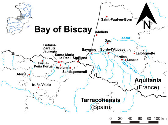 The Roman occupation of the neighbouring areas of the northern Iberian Peninsula and southern France is well documented by numerous archaeological excavations carried out in this geographic area [4,5,6,7,8,9,10,11,12]. The communication network, by both terrestrial and maritime routes, linking the Cantabrian coast to the rest of the Roman world, is well known [13,14,15,16,17,18,19]. The connection between the Cantabrian coast and the coasts of Aquitaine and Brittany was mentioned by Caesar (CAES. Gal.3.26.6), Strabo (STR. 3.4.18) and Orosius (OROS. Hist.6.21.4) in de Soto [20]. Important harbours such as Oiasso (Irun), Lapurdum (Bayonne) and Burdigala (Bordeaux) as well as secondary harbours in rivers and estuaries (e.g., Portus Amanum-Flaviobriga in Castro Urdiales, Forua in Gernika, Zarautz, Donostia and Hondarribia) have been identified for the trade of goods (e.g., wine, fish products, lard, broad beans and mineral resources). All of them articulated a network of ports that guaranteed maritime communications around the Bay of Biscay [21,22,23,24,25,26]. The maritime route was active together with the main continental roads of Ab Asturica-Burdigalam and secondary routes crossing the Pyrenees, Tarraco-Oiasso and Pisoraca VI-Portu Amamus. Maritime, waterway, and continental routes constitute the main trading communication network operating in the eastern Cantabrian region, linking the Roman provinces of Aquitania and Tarraconensis. In this way, the northeast of Hispania was fully integrated into the framework of Roman trade across the Cantabrian Sea.