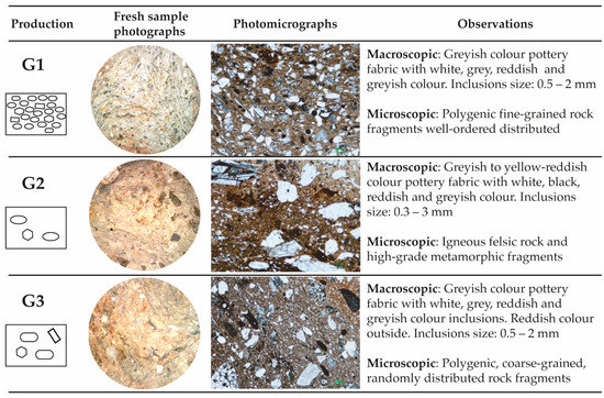 Synoptic sketch of macroscopic and microscopic features of the three main pottery productions. Fresh sample photographs: diameter corresponds to 1 cm. Photomicrographs: width of field corresponds to 2.4 mm. Geometric symbols in the synoptic sketch correspond to inclusions of different compositions.