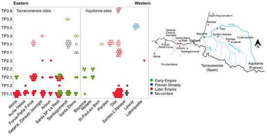 Geographic location of the archaeological sites where samples were analysed around the Bay of Biscay: sites of Aloria (Amurrio, Araba); Iruña-Veleia (Iruña de Oca, Araba); Forua-Peña Forua (Forua, Bizkaia); Getaria-Zarautz Jauregia (Getaria, Gipuzkoa); Santa Maria La Real (Zarautz, Gipuzkoa); Arbium (Zarautz, Gipuzkoa); Santa Elena (Irun, Gipuzkoa); Santiagomendi (Astigarraga, Gipuzkoa) in Tarraconensian province, Spain. Sites of Saint-Paul-en-Born (Landes, Nouvelle-Aquitaine); Moliets-et-Maa (Landes); Bayonne (Nouvelle-Aquitaine); Dax (Landes, Nouvelle-Aquitaine); Lalonquette (Pyrénées-Atlantiques, Nouvelle-Aquitaine); Pardies (Peyrehorade, Landes); Sorde-l’Abbaye (Landes, Nouvelle-Aquitaine); Lescar (Pau, Nouvelle-Aquitaine) in Aquitanian province, France.