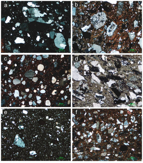 The petrographic study was performed on thin sections using a Nikon Eclipse LV100pol polarised light microscope equipped with a DSF-11 digital camera and DSL-2 control unit at the Laboratory of the Department of Geology, University of the Basque Country (UPV/EHU). Each thin section was analysed under plane and cross-polarised transmitted light to evaluate the mineralogy and clay matrix characteristics according to [35,36], with special attention to some aspects described in [37,38,39].