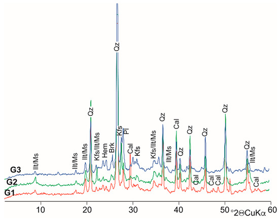 XRD patterns of representative samples for main G1, G2 and G3 pottery fabric groups. Mineral abbreviations after Whitney and Evans [41]: Cal (Calcite), Ilt (Illite), Ms (Muscovite), Kfs (Potasium feldspar), Pl (Plagioclase), Hem (Hematite), Brk (Brookite) and Qz (Quartz).