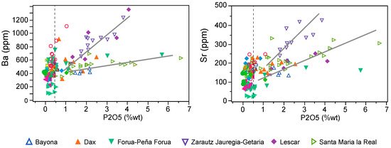 Bivariate plots of P2O5 vs. Sr and P2O5 vs. Ba show different correlations according to the archaeological site. Dotted line corresponds to the limit between modified and unmodified pottery samples.