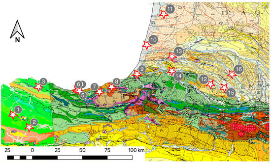 Geological map of the studied region. Brown: Palaeozoic and Permian; Pink: Palaeozoic Ursuya massif; Red: granitoids; Purple: Triassic; Blue: Jurassic; Green: Cretaceous; Orange: Paleogene; Yellow: Eocene; Light brown and Grey: Quaternary. Stars indicate the location of the sites: 1: Aloria, 2: Iruña-Veleia, 3: Forua-Peña Forua, 4: Getaria-Zarautz Jauregia, 5: Arbium 6: Santa Maria la Real, 7: Santiagomendi, 8: Santa Elena, 9: Bayonne, 10: Moliets, 11: Saint-Paul-en-Born, 12: Pardies, 13: Dax, 14: Sordes l’Abbaye, 15: Lescar, 16: Lalonquete. The geological maps of Spain and France are available at the Spanish (IGME) and French Geological Survey (BRGM) geological services [69,70].
