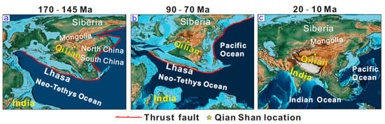 Reconstruction of the sea and land distribution map of East Asia from Neoproterozoic to Cenozoic. (a,b) The convergence of the Lhasa terrane and Asia caused the exhumation of the Qilian Shan in the Cretaceous. (c) The subduction of the Indian Plate under Asia led to multistage exhumation events in the Qilian Shan during the Cenozoic. The original maps were obtained from [58].
