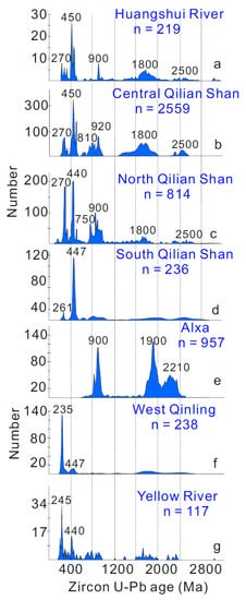 Figure 3a shows that the detrital zircon ages of the three samples from the Huangshui River can be divided into five peaks with age ranges of 246–509, 899–1176, 1620–2089, and 2131–2610 Ma [22,23]. Characteristic age spectra of the Huangshui River samples resemble the detrital zircon age spectra of samples from the Central Qilian Shan [47] (Figure 3b). They also match the North Qilian Shan’s source rock signatures [48,49] (Figure 3c), mainly because the Central and North Qilian terranes have similar evolutionary histories [26,50]. In addition, the data are broadly comparable to those from modern river and bedrock samples along the South Qilian Shan [44,61] (Figure 3d), Alxa Block [58] (Figure 3e), West Qinling [63] (Figure 3f), and upper reaches of the Yellow River [64] (Figure 3g). Age ranges of 700–900 Ma, 1800 Ma, and 2500 Ma were not obtained for the South Qilian Shan and West Qinling, whereas the samples from the Alxa Block lacked ages within the range of 200–500 Ma. Furthermore, the peak age composition of Yellow River samples differed from that of Huangshui River samples.
