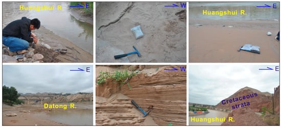 Photos of fluvial detrital sample collection in the Huangshui River Basin.
