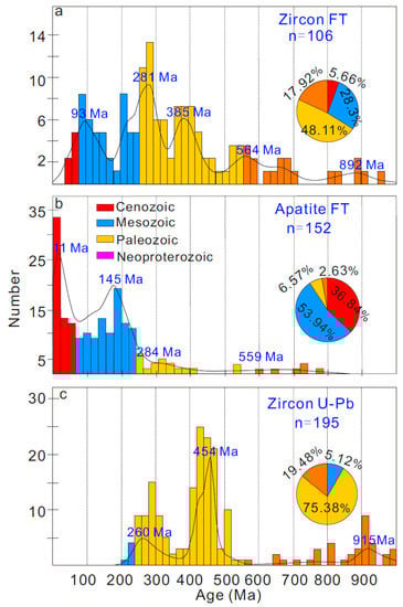 Zircon U-Pb ages (≤1000 Ma) of the Huangshui River samples included the (1) Neoproterozoic age (19.48% of the grains), (2) Paleozoic age (75.38% of the grains), and (3) Mesozoic age (~5.12% of the grains) (Figure 5c). All other grains with FT ≤ U-Pb ages were considered to represent source rocks that cooled due to exhumation during the Mesozoic and Cenozoic. AFT data, which provided information on the most recent thermal history and exhumation of source rocks, complemented the zircon U-Pb and ZFT data.