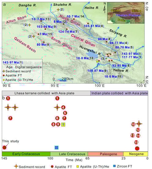 (a) Temporal distribution of tectonic events recorded in the Qilian Shan. (1): [70]; (2): [54,56,71]; (3): [57]; (4): [72]; (5): [42]; (6): [43]; (7): [18,20]; (8): [8,42,73]; (9): [17,74,75]; (10): [42,43,70]; (11): [61,62]; (12): [18]; (13): [46]; (14): [76,77]; (15): [18,78]. (b) Summary map of Mesozoic and Cenozoic low-temperature thermochronology and sedimentology in the Central Qilian Shan and its surrounding areas. The exhumation events of Mesozoic and Late Cenozoic are related to the collision of the Lhasa terrane and India plate with the Asia continent, respectively. The numbers in the figure correspond to those in Figure 6a.