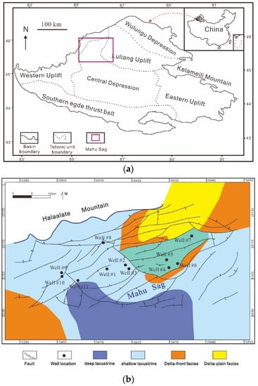 Figure 1. (a) The relative location of the studied areas in Junggar Basin, and (b) well locations of shale samples in the Mahu Sag of the Junggar Basin.