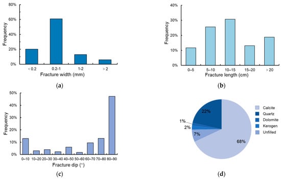 Figure 2. The statistical results of fracture characteristics and fillings of fractures from the drilling cores, microsections, and borehole imaging logging data. (a) Frequency distribution of fracture widths in the study area; (b) Frequency distribution of fracture lengths in the study area; (c) Frequency distribution of fracture dips in the study area; (d) Map of the percentage of fracture fills in the study area.