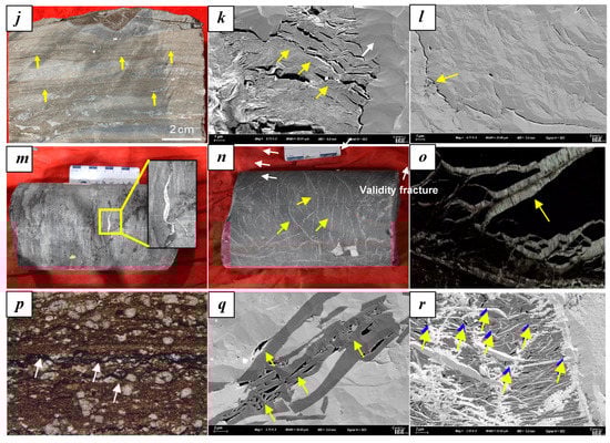 Non-tectonic fractures in the Fengcheng Formation of the Mahu Sag are primarily bedding fractures, hydraulic fractures, and hydrocarbon-generating overpressure fractures. Bedding fractures are characterized by near-horizontal or low-angle features, exhibiting rough surfaces (Figure 4j). In the microscope, the bedding fractures appear parallel to each other and display a wavy pattern (Figure 4h,i). Hydraulic fractures, typically filled with fibrous calcite, possess restricted extension lengths. The fracture surface manifests discernible branching configurations, evocative of tree branches (Figure 4m–o). The majority of fractures generated by hydrocarbon-generating overpressure fractures are microscopic fractures that exhibit high effectiveness. Based on the microsection and FE-SEM images, these types of fractures mostly occur at the edges of mineral grains or inside organic matter with irregular shapes (Figure 4p–r).