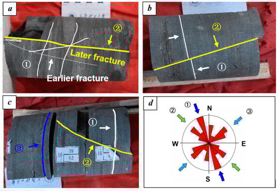 The formation periods of natural fractures can be inferred by examining the filling order and intersection relationships among different fractures on core samples. Figure 5a–c display two sets or three sets of shear fractures, which were filled with calcite. In Figure 5a, a late-formed high-angle cross-layer shear fracture is observed cutting through two early-formed cross-layer shear fractures. Figure 5b shows a late-formed high-angle tensile fracture intersecting with an early-formed bedding fracture. Figure 5c illustrates a late-formed shear fracture passing through an unfilled bedding fracture and an earlier-formed calcite-filled bedding fracture. Figure 5d depicts a rose diagram of strikes of tectonic fractures, indicating three formation periods of natural fractures.