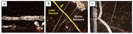 Observation of microsections reveals the presence of microfractures in the Fengcheng Formation exhibiting multiple cutting phenomena. Figure 6a depicts the characteristics of hydraulic fractures at the microscopic scale, with fractures filled by multi-stage calcite. Due to the recurring opening and closing of the fractures, the calcite crystals exhibit multi-stage growth characteristics. The initial calcite crystal growth is constrained, leading to the formation of tensile blocky-shaped calcite crystals. Subsequently, fractures expand, permitting unrestricted crystal growth. Moreover, an evident mutual cutting relationship exists between the fractures in the microsection shown in Figure 6b. Early calcite veins are intersected by thicker calcite veins that formed later (as illustrated in Figure 6b). Figure 6c illustrates three-stage veins, indicating that the fractures in the Fengcheng Formation have experienced a minimum of three stages. In summary, the microstructure of the Fengcheng Formation is highly intricate and displays characteristics indicative of multiple filling stages.