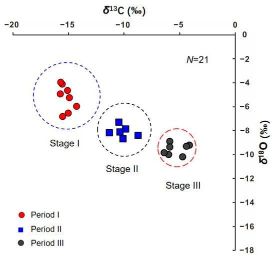 Figure 7. The relationship of δ18O and δ13C isotopes of fracture fillings in the Fengcheng Formation of the Mahu Sag.
