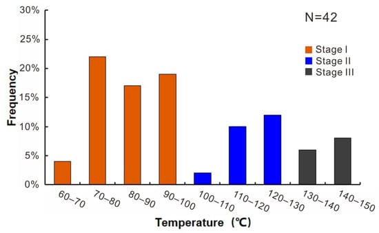 Figure 9. The distribution of the homogenization temperature of fluid inclusions in natural fracture fillings, the sample obtained from the Fengcheng Formation in the Mahu Sag of the Junggar Basin.