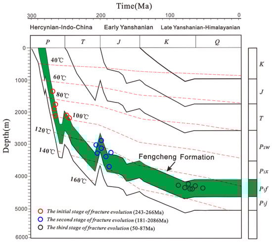 Figure 10. The burial history of Fengnan #4 Well and the estimated time-depth of different stages fractures in the Fengcheng Formation of the Mahu Sag.