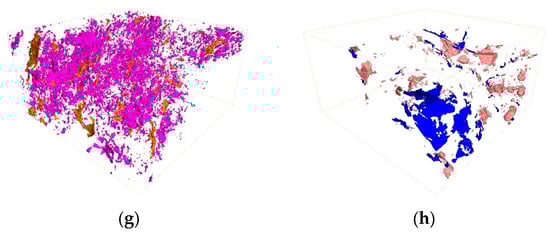 Figure 11. Nano-CT results of the shale sample, obtained from the Maye #1 Well in the Fengcheng Formation of the Mahu Sag; (a) 3D image of mineral composition; (b) 3D image of the volume of pores and fractures; (c) 3D image of the inorganic pores; (d) 3D image of the organic pores; (e) 3D image of the inorganic fractures; (f) 3D image of the organic fractures; (g) 3D image of the inorganic pores and fractures; (h) 3D image of the organic pores and fractures.