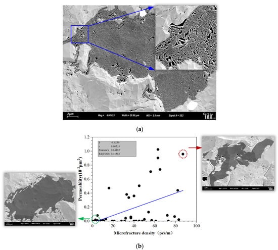 Figure 12a indicates the morphology and shape of the hydrocarbon overpressure microfractures in the Fengcheng Formation of the Mahu Sag. Combined with FE-SEM, it was proven that hydrocarbon overpressure microfractures, with small pore sizes and good connectivity, formed an effective permeability system. Hydrocarbon overpressure microfractures connect the isolated micropores in the shale reservoir, forming a connected pore space. Figure 12b illustrates the relationship between the densities of hydrocarbon-generating overpressure microfractures and the permeabilities of the shale reservoir. The results reveal a positive correlation (R2 = 0.6448) between the densities of hydrocarbon-generating overpressure microfractures and the permeabilities of the shale reservoir. Figure 12b left shows the SEM image of the shale reservoir in the study area for low permeability and overpressure microfractures density; Figure 12b right shows the SEM image of the shale reservoir in the study area for high permeability and overpressure microfractures density. As the densities of hydrocarbon-generating overpressure microfractures increase, permeabilities of the shale reservoir also increase. Consequently, hydrocarbon-generating overpressure microfractures enhance the effective storage capacity of the reservoir and optimize its pore structure [27]. Furthermore, the microfracture can establish a connection between the organic matter and the external flow channels, ultimately augmenting the reservoir’s permeability.