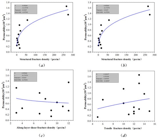 Figure 13. The relationships between the (a) tectonic fracture density, (b) high-angle interlayer shear fracture density, (c) along-layer shear fracture density, (d) tensile fracture density, and daily production in the Fengcheng Formation of the Mahu Sag.