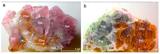 Typical occurrence of clinohumite in the Cong Troi deposit of Luc Yen: (a) subhedral orange clinohumite with pyrite inclusions partially overgrowing purplish gem spinel and filling in fractures and cavities in calcitic marbles; (b) unhedral orange-brown clinohumite overgrowing lavender spinel with green pargasite in dolomitic calcite marble. Mineral symbols: Spl—spinel, Chu—clinohumite, Prg—pargasite, Py—pyrite, Cal—calcite.
