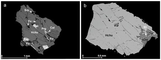 Back-scattered electron microscopy images of a polished section of the Luc Yen hydroxylclinohumite: (a) hydroxylclinohumite with calcite, forsterite, pargasite and serpentine inclusions (sample V-11-2a); (b) hydroxylclinohumite altered from one rim to chlorite (sample V-12-03). Cal—calcite; Hchu—hydroxylclinohumite; Fo—forsterite; Prg—pargasite; Spr—serpentine; Chl—chlorite; Rt—rutile.