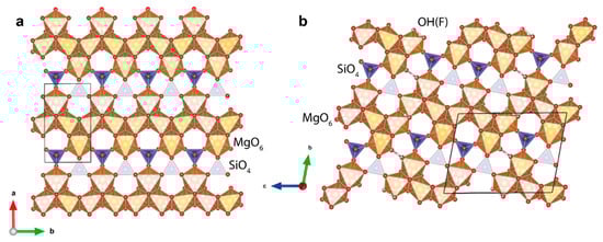 Both composition and crystal structure of humite group minerals are close to olivine. Their crystal structure is based on isolated silica-oxygen tetrahedrons [SiO4], connected with each other through Mg atoms. Forsterite layers (Mg2SiO4) are interspersed with Mg(OH,F)2 layers; their ratio progressively changes from norbergite (1/1) to clinohumite (4/1). In general, the crystal structure of clinohumite is based on a hexagonal close-packed array (2H) of anions similar to that of forsterite (Figure 3a) [46]. As in the olivine structure type, in the structures of all humite minerals, 1/2 of the octahedral voids are occupied by the M cations while the occupancy of the available tetrahedral voids decreases from 1/8 in olivine over 1/9 in clinohumite (n = 4) to 1/12 in norbergite (n = 1) [47]. This structure can be also described as a heteropolyhedral framework consisting of stacking of identical sheets parallel to the (001) plane [48]. In turn, the sheets based on chains of edge-sharing Mg1-5 octahedra are connected by vertex-shared Si1-2 tetrahedra. The F ions and OH groups are located in the small cavities on the “missing” (compared with forsterite structure) SiO4 tetrahedra (Figure 3b).