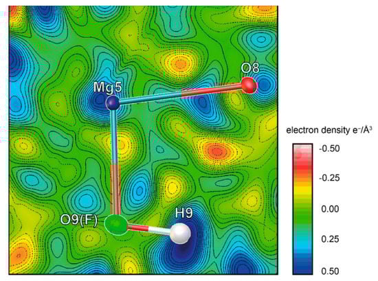Position of the H atoms were found using Fourier difference synthesis (Fo-Fcalc) around O9(F) site (Figure 4). Initially, two residual density ~0.30 (H10) and 0.50 e– (H9) peaks within 0.90–1.00 Å distance from O9 site for the samples V-11-2d and V-11-2a, respectively, were found. Both sites were refined as H atoms; however Mg-H10 distance was 1.85–1.95 Å, anomalously short to be real atom and excluded from the next refinement steps. For the V-12-O3 sample only one peak of residual density near O9 site was observed. This peak corresponds to the position of H9 atoms. The occupancy of the H9 sites was fixed according the charge balance requirements.