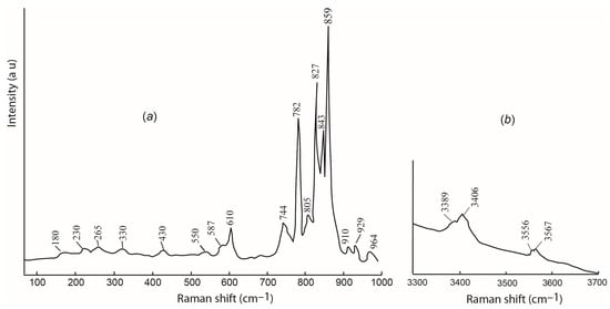 Peaks positions (Figure 6a) are assigned according to Raman spectra reported in previous studies [53,54,55]): (1) the most intense bands 805, 827, 843, and 859 cm−1 are corresponding to the stretching vibrations (ν1) of the SiO4 tetrahedra; (2) weak bands at 910, 929 and 964 cm−1 are attributed to asymmetric stretching vibrations (ν3) of the SiO4 tetrahedra; (3) the bands of 744, 782 cm−1 are ascribed to MgOH and TiOH deformations; (4) the bands at 550, 587, and 610 are corresponding to the out of plane (ν4) bending modes of the SiO4; (5) band at 430 cm−1 is in plane (ν2) bending mode of the SiO4, and (6) the bands at 180, 230, 265, and 330 are due to the vibrations of the MgO6 octahedra and the lattice vibrations. The most important peaks for hydroxylclinohumite in our spectrum are the ones which occur as two doublets at about 3389, 3406 cm−1, 3556, and 3567 cm−1 (Figure 6b) These bands in the OH-stretching region for the hydroxylclinohumite sample agree with those reported by Hurai et al. [36] who presented doublet 3339, and 3410 cm−1 and triplet 3560, 3570, and 3578 cm−1 and Liu et al. [53], who observed three strong bands at 3397, 3529 and 3564 cm−1. The most intense band of stretching vibrations O–H at 3406 cm−1 corresponds to strong hydrogen bonds OH···O, which are formed between OH groups being at a relatively short distance from each other. The faint band at 3556 cm−1 corresponds to the local situation, when the O(5) position, being an acceptor of the hydrogen bond, is occupied by F [56].