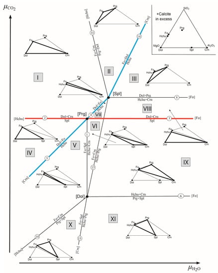 The formation of hydroxylclinohumite in this system is controlled by three reactions (5, 4, and 14, blue solid line on Figure 7), by which it is completely destroyed when decreases. Monovariant singular equilibria of the reactions 1–3 (Table 4) are controlled only by the chemical potential of CO2 in the fluid and do not depend on the activity of water in the medium. Thus, in case of increasing (and , spinel is replaced by an association of corundum+dolomite according to reactions 2 and 3 (red solid line on Figure 7). This monovariant line divides the diagram into two parts (Figure 7). In the upper part, only corundum is stable in association with forsterite, pargasite and dolomite (fields I, and II), and with increasing water activity, corundum associated with hydroxylclinohumite which replace forsterite and pargasite (fields III, VII, and VIII).