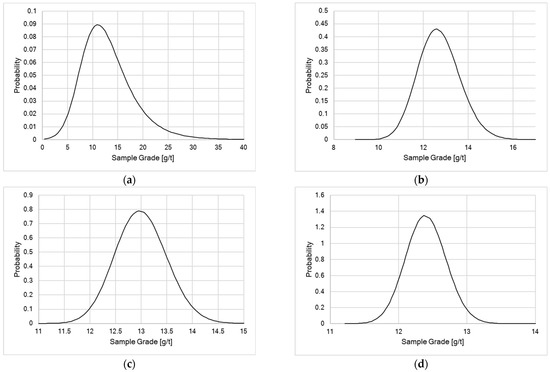 Full sampling distributions calculated for results of Minnitt et al. [10] using the characteristic function method. The figures correspond to decreasing particle top size, (a–d).