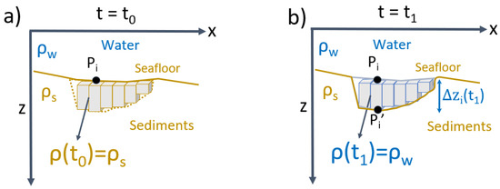 Another important phenomenon is the seafloor movement caused by hydrocarbon exploitation. If the reservoir pore pressure decreases, it generates reservoir compaction, resulting in the seafloor sinking [16,31,32,33]. When it occurs, the region of subsidence, initially composed of seafloor sediments in time (Figure 3a), is replaced by water in time (Figure 3b) just after the subsidence. We assume that there is only vertical displacement on the seafloor. It means that the ith measurement point on the seafloor in , , changes to in (Figure 3). The opposite occurs when the pore pressure increases.