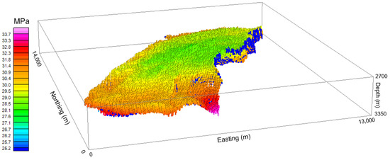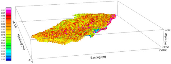 The entire interpretation model comprises the extent of 14,050 m in the north axis, 13,250 m in the east axis, and 625 m in the vertical direction. The top and bottom depths are 2712 m and 3337 m deep, respectively. The data relating to the reservoir model (e.g., pore pressure, density, and Poisson’s ratio) make up 1,950,312 measurements for each property, with a grid spacing of 50 m along the north and east directions and 25 m in the vertical direction. The data came from reservoir fluid flow simulations for the following years: 2002, 2013, 2014, 2015, and 2018. It is worth noting that the field produces only oil, not gas. The observation points consist of a regular grid of 57 × 54 points in the north and east directions, respectively, with a grid spacing of 250 m in both directions, totaling 3078 observations. The depth of the observation grid is 1338 m deep, the average bathymetry in the oil field region. Over the years, the variation in density has gone from 2.08 to 2.64 , and pore pressure data range from 33.2 to 34.2 MPa. The model background has a density of 2.64 and a pore pressure of 0 Mpa, representing the region outside the reservoir. Poisson’s ratio data values vary from 0.3237 to 0.3723. Figure 6, Figure 7 and Figure 8 show, respectively, the 3D distributions of density, pore pressure, and Poisson’s ratio in 2002. In order to obtain a better visualization, only the values different from the background are shown.
