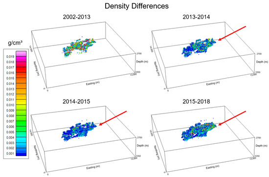 Three-dimensional perspective views of the density differences over the years within the reservoir model (lower volume in Figure 6). Red arrows indicate the region where the density is increasing. Only values that are different from zero are shown.