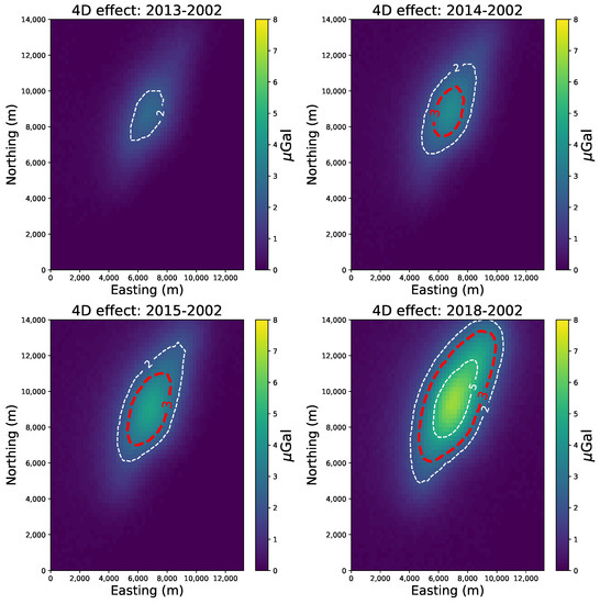 Since 2002 is the first year for which we have data, the differences over the years (2013 to 2018) due to density changes within the reservoir (Figure 9) were related to it, producing 4D gravity anomalies (Equation (10)). Figure 10 shows the 4D gravity anomalies over the production years, where we can see that the feasible limit of 3 μGal (dashed red line) is surpassed in 2014 and reaches the amplitude of about 7 μGal in 2018. Thus, according to this scenario, the 4D gravity effect due to oil production (Equation (10)) could be detected after 12 years from the base year.