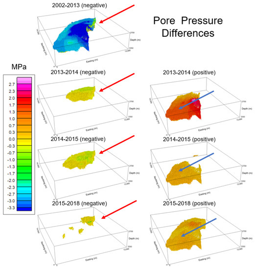 The differences over the years in pore pressure distribution (Figure 11) have a more complex pattern than the density differences (Figure 9). For ease of visualization, we split the pore pressure differences (Figure 11) into two parts: negative (left panels) and positive (right panels) parts. Equivalent to Figure 9, Figure 11 shows only cells with values that are different from zero. Note that between 2002 and 2013, the pore pressure differences are only negative and more intense in the same region where the density differences increase (red arrow in Figure 9). From 2013 to 2018, the pore pressure decreased in this region (red arrows in the left panels in Figure 11), but with less intensity and in smaller volume (i.e., a smaller number of model cells). However, pore pressure increased in the southwest region of the model (blue arrows in the right panels in Figure 11) between 2013 and 2018. We believe that this rise in pore pressure is related to fluid injection in the reservoir as a strategy to avoid severe depletion during the production life of the oil field.