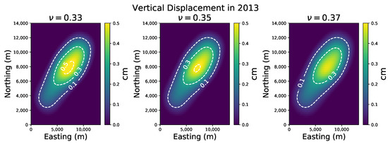 Seafloor movement simulated using Equation (5) for the 2013 year and using three different Poisson ratios (). The base year is 2002. Positive values represent the subsidence of the seafloor.