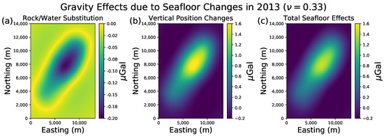 Gravity effect in 2013 due to: (a) rock/water substitution on the seafloor; (b) change of observations’ vertical position and; (c) seafloor changes, which is the sum of (a,b). Observation points are located on the seafloor with a regular spacing of 250 m with .