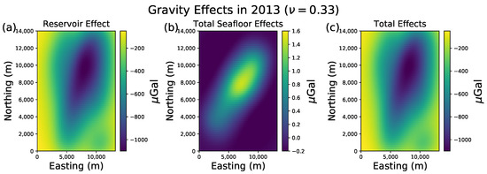 Using the modified bathymetry, we updated the reservoir gravity effect over the years (with ) to compare with the seafloor change gravity effects. These effects for 2013 are shown in Figure 15, where the total gravity is the sum of the reservoir and seafloor effects. The reservoir effect (Figure 15a) dominates the total gravity effect (Figure 15c) because it is three orders of magnitude greater than the gravity effect due to the seafloor changes (Figure 14c and Figure 15b). The same is valid for other scenarios in different years and with different Poisson ratios.