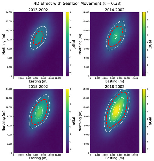 At last, we calculated the 4D gravity anomaly over the years (using Equation (11) and ) for the scenarios with seafloor changes. Figure 16 shows that the resulting 4D gravity anomaly is very similar in shape to that of the no-subsidence scenario (Figure 10). However, there is an increase in the maximum anomaly amplitude of about 14 %, which also occurs with the other two Poisson ratios (0.35 and 0.37), although with less intensity. In addition, the 4D gravity anomaly exceeds the feasible limit in 2013 when considering the vertical movement one year earlier than the case with no vertical movement (Figure 10). This result shows that even changes in the seafloor of a few millimeters cannot be neglected. In the Supplementary Material, we conducted tests on synthetic noise-corrupted data to investigate the sensitivity of our method to deal with distinct noise levels (Figures S1–S6).